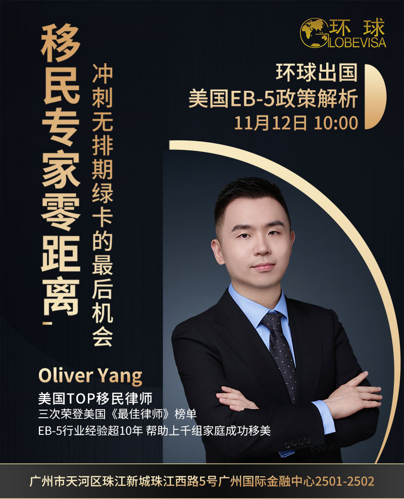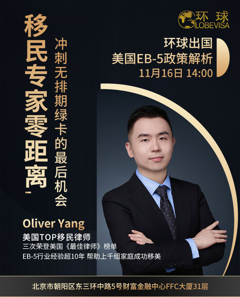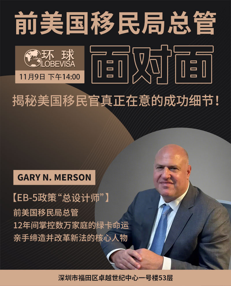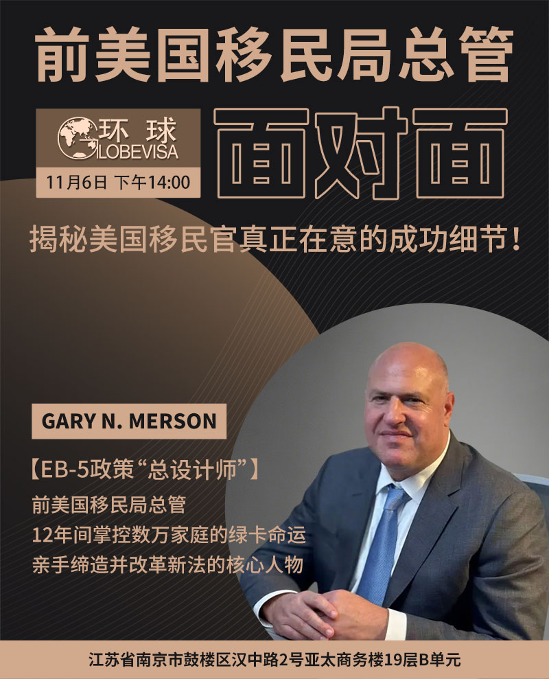 美国前移民局总管解读 EB5最新政策趋势 想知道美国移民官审核时最在意什么?前美国移民局总管、EB-5政策 “总设计师” Gary N. Merson面对面揭秘!12年掌管数万家庭绿卡命运,更是EB-5新法改革核心人物 苏州 | 南京 | 上海 | 深圳 | 广州 | 成都 | 青岛 | 北京 立即预约席位 环球出国美国EB5移民巡回活动 11月5日-11月9日 活动内容 前美国移民局总管 面对面揭秘! 移民官视角:揭秘EB-5审核内幕与成功法则 新法新机遇:解析EB-5排期迷雾与未来走向 风险和把控:剖析投资安全与绿卡保障策略 揭秘美国移民官真正在意的成功细节!苏州、南京、上海、深圳! 总有一站适合您!别错过近距离与移民官沟通的珍贵机会!! 在线咨询 11月12日-11月16日 活动内容 美国TOP移民律师 零距离解析! 美国EB-5TOP律师深度剖析热点问题! 优质的EB-5项目都具备哪些核心优势? 移民美国成功落地的核心关键是什么? 冲刺无排期绿卡的最后机会!广州、成都、青岛、北京! 总有一站适合您!别错过冲刺 “无排期绿卡” 的机会! 在线咨询 环球出国特邀 嘉宾介绍 加里•默尔森 Gary N. Merson 前美国移民局总管(Chief of Staff) 12年掌管数万家庭绿卡命运,更是EB-5新法改革核心人物 美国知名移民律师Oliver Yang 美国资深移民律师,从业经验超10年 他三次荣登《最佳律师》榜单,EB-5行业经验超10年,帮上千组家庭成功移美 八城巡回 在线预约 2025年11月5日 14:00 环球出国苏州站 · 前美国移民局总管面对面 环球出国苏州公司 地址:苏州市工业园区苏州大道西9号中海财富中心西塔2306-2307室 在线预约 2025年11月6日 14:00 环球出国南京站 · 前美国移民局总管面对面 环球出国南京公司地址:江苏省南京市鼓楼区汉中路2号亚太商务楼19层B单元 在线预约 2025年11月7日 14:00 环球出国上海站 · 前美国移民局总管面对面 环球出国上海公司地址:上海市静安区南京西路1266号恒隆二期4003-4007室 在线预约 2025年11月9日 14:00 环球出国深圳站 · 前美国移民局总管面对面 环球出国深圳公司地址:深圳市福田区卓越世纪中心一号楼53层 在线预约 2025年11月12日 10:00 环球出国广州站 · 移民专家零距离 环球出国广州公司地址:广州市天河区珠江新城珠江西路5号广州国际金融中心2501-2502 在线预约 2025年11月13日 14:00 环球出国成都站 · 移民专家零距离 环球出国成都公司地址:成都市锦江区红星路三段1号国际金融中心2号办公楼1908 在线预约 2025年11月14日 10:00 环球出国青岛站 · 移民专家零距离 环球出国青岛公司地址:青岛市市南区香港中路2号海航万邦中心1109室(青岛世贸中心西侧) 在线预约 2025年11月16日 14:00 环球出国北京站 · 移民专家零距离 环球出国北京公司地址:北京市朝阳区东三环中路5号财富金融中心FFC大厦31层 在线预约 免费定制方案 立即预约 在线占位 全程贴心服务 祝您移路顺风 详细解读及了解更多移民活动,请咨询环球移民专家 姓名: 电话号码: 电子邮箱: 立即预约活动 姓名: 电话号码: 电子邮箱: 免费定制方案 环球出国往期精彩活动回顾 葡萄牙移民巡回活动回顾 美国EB5投资移民活动回顾 塞浦路斯移民全国巡回集锦 环球出国 品牌实力 环球出国全球业务布局,为想要实现全球梦的人士提供多元化的产品选择 全球50余家一体化服务机构 0 + 推出超100个项目供客户选择 0 + 服务超11万组客户实现移民梦想 0 + 和百余位律师合作 0 + 服务超过114个国家和地区的客户 0 +