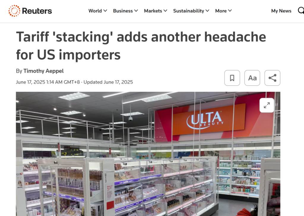 在全球供应链日趋分散的背景下,越来越多中国出口商正在重新评估美国市场是否还值得进入。6月16日,《路透社》的一篇报道称,所谓“关税叠加”(Tariff Stacking)正对美国进口商造成持续冲击:同一批中国制造的商品,可能因多项政策同时适用而被反复征税。这不仅使售价变高,也令许多依赖出口的企业在战略上陷入被动。