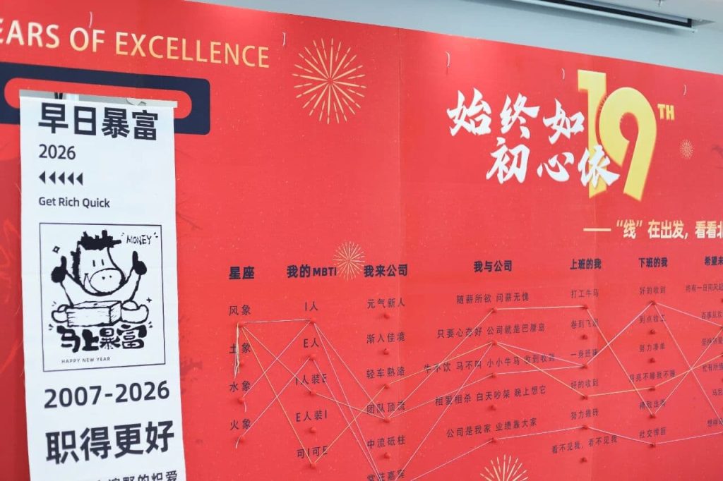 签到环节独具匠心,不再是简单的姓名登记,而是一场“绕线艺术签到”。每位参与者根据自己的星座、MBTI性格类型以及对公司的真实感受,用彩色丝线在特制展板上缠绕。