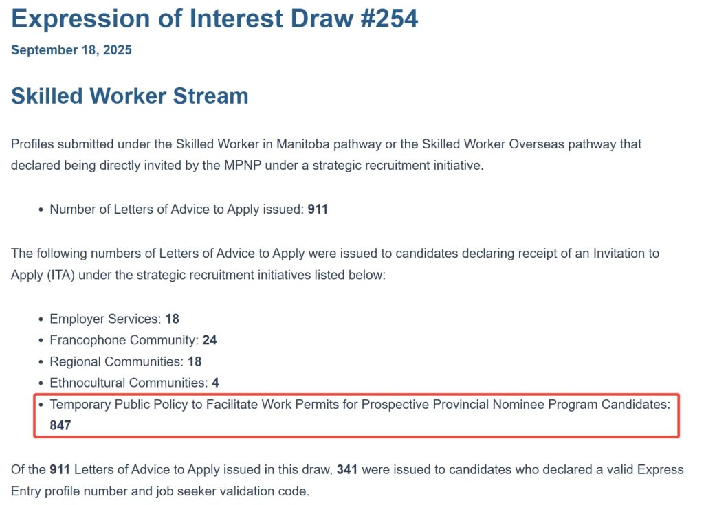 在9月18日举行的第254次省提名抽签中,曼省共发出了911份邀请函(LAA)。令人关注的是,其中有847份邀请都指向了同一类人:那些申请了“临时公共政策”的候选人。