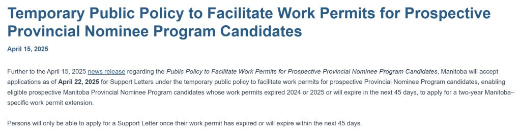 这个所谓的“临时公共政策”,是曼省于今年4月22日启动的一项特殊政策。它为那些工签于2024或2025年到期,且符合省提名资格的申请人,提供了一个为期两年的工作许可延期。