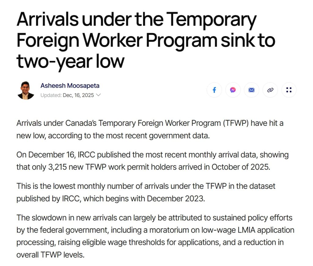 2025年加拿大移民市场的风向标发生了剧烈震动,曾经被视为“快捷键”的雇主担保项目,正处于舆论的风口浪尖。12月16日,加拿大移民局(IRCC)新数据显示,2025年10月仅有3,215名新的临时外国工人抵达加拿大,创下两年来的低点。这一数据并非偶然,而是加拿大联邦政府一系列旨在保护本国劳动力市场、提高薪资门槛的持续政策(如暂停低薪岗位LMIA审批、缩减总体配额)的直接结果。