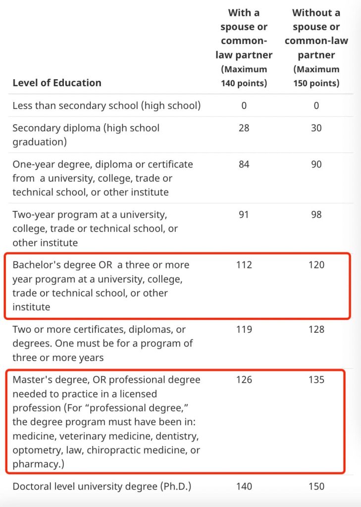 在EE通道 CRS(综合排名系统)评分中,硕士学位相较于本科或专科拥有显著的分数优势: