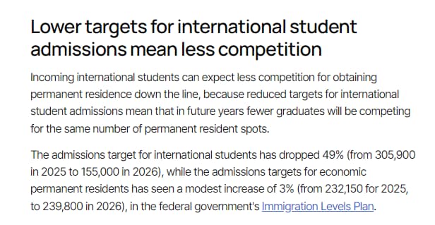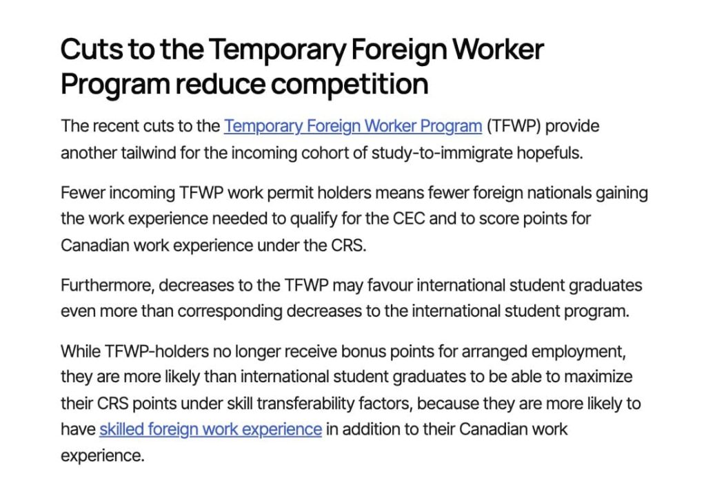 - 挤压外部竞争,名额向毕业生倾斜:政府同时大幅收紧“临时外国工人项目”(TFWP),提高申请门槛。这相当于减少了通过纯“务工”途径移民的竞争者,更多的永久居民配额将定向分配给在加完成学业的国际毕业生。
