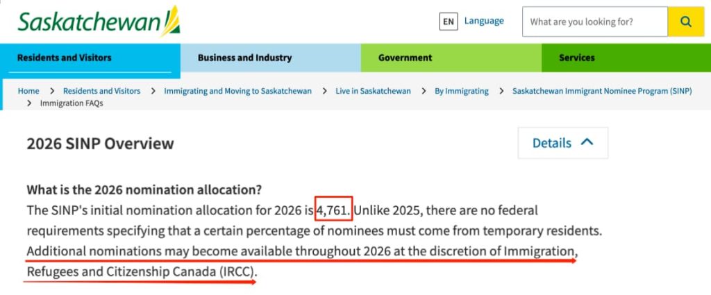 萨省2026年提名配额为4,761个,与2025年完全持平。