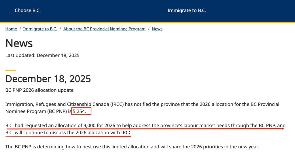 BC省2026年提名配额为5,254个,较2025年的6,214个不增反降;