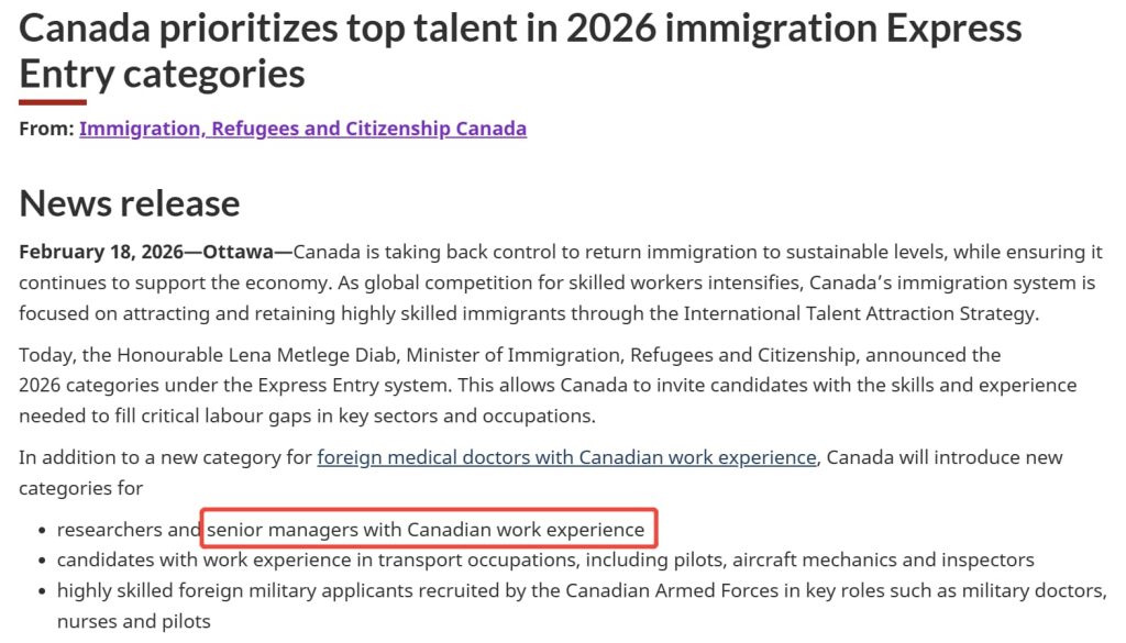 熟悉加拿大移民的朋友都知道,自2024年以来,如果没有省提名加持或者本地工作经验,想在常规的EE池子里靠打分硬性获邀,门槛已经非常高。但现在,一旦您进入了“高管定向选择(Category-based selection)”的池子,您就不需要再和成千上万的其他人去内卷高分。