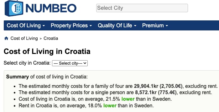 相较于西欧和北欧国家,克罗地亚的生活成本更具吸引力。根据Numbeo的数据,克罗地亚的平均生活成本比美国低23.9%,租金更是低56.7%。 对于单身人士而言,不含租金的月度开销约为775.4欧元,就能住进亚得里亚海沿岸的小城,日常推开窗就是蓝白海岸线 —— 真正实现 “用低成本享受美丽风景”。