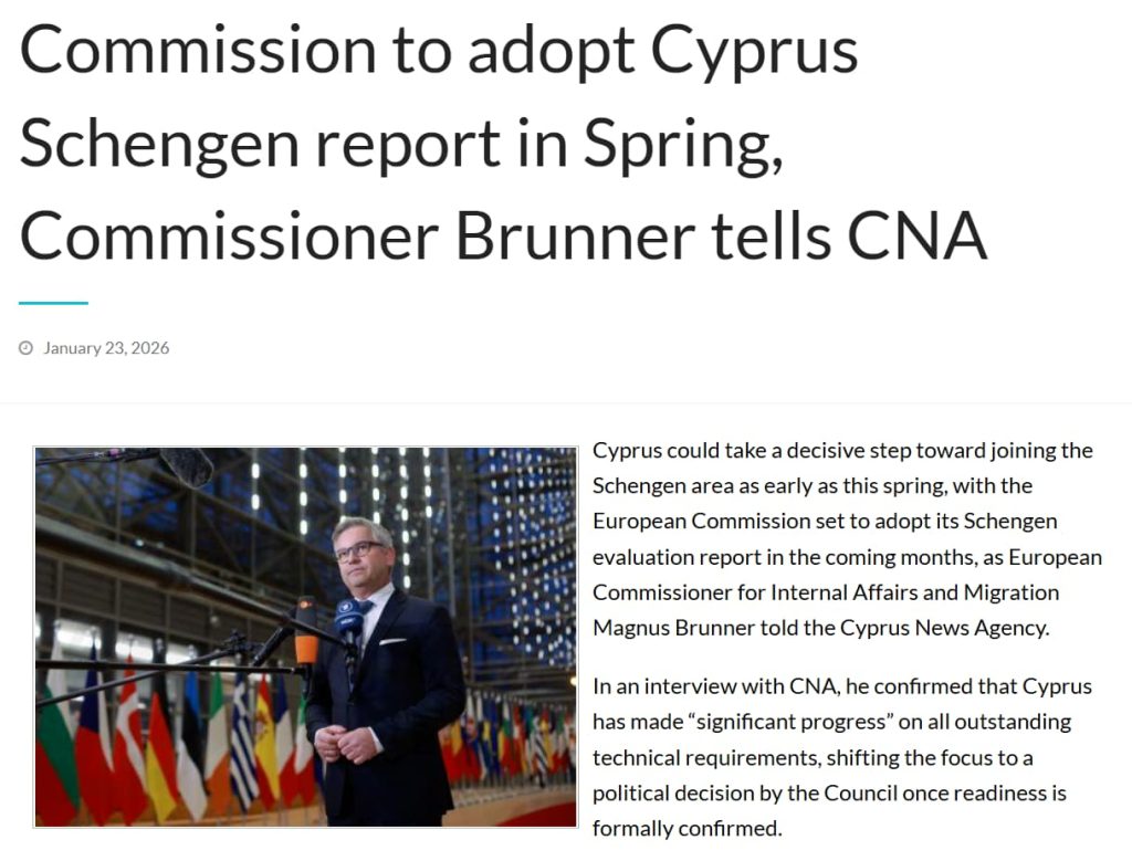 2026 年 1 月 23 日(周五),欧盟委员会内政与移民事务专员马格努斯・布鲁纳(Magnus Brunner),在塞浦路斯首都尼科西亚正式官宣:欧盟针对塞浦路斯的申根资格评估,已进入冲刺阶段,终版报告预计将于 2026 年春季正式通过。