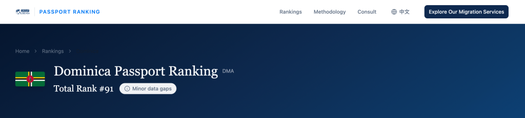 根据环球出国旗下 Passport Ranking 页面,多米尼克在2026 Globevisa Passport Ranking中综合排名第91位,在199个国家和地区中处于中位梯队,其中流动性排名第69、治理排名第74、教育排名第104、生活质量排名第102。这一排名与传统“只算免签数”的护照榜单不同,而是从流动性、治理、安全、教育、生活质量五个维度对身份价值进行结构化评估。
