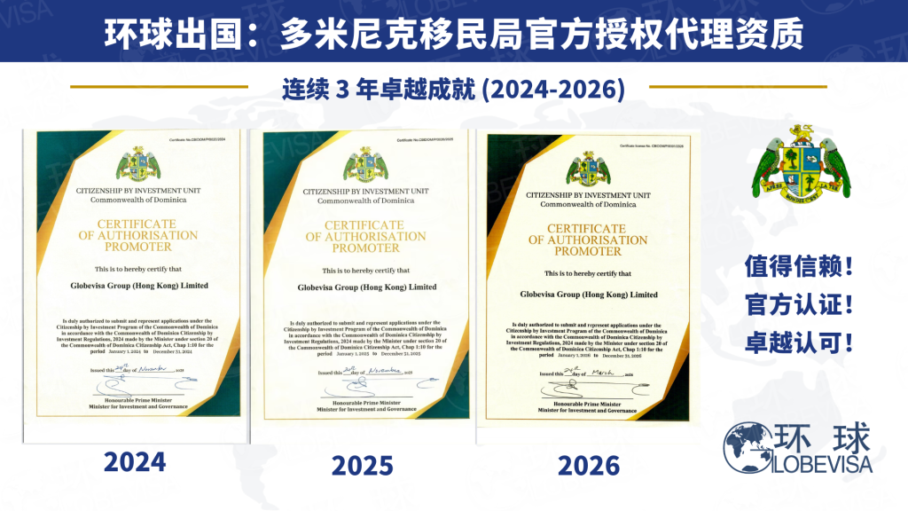 A:首先,项目本身有清晰法律依据,官方法律基础包括《多米尼克联邦宪法》第101条、《多米尼克公民法》第8节和第9节,以及《2024年多米尼克投资入籍条例》。其次,环球出国是国内唯一一家连续三年持有多米尼克官方授权代理资质的机构(2024年-2026年),这使得其在流程衔接、合规递交和政策理解上具备明显优势。