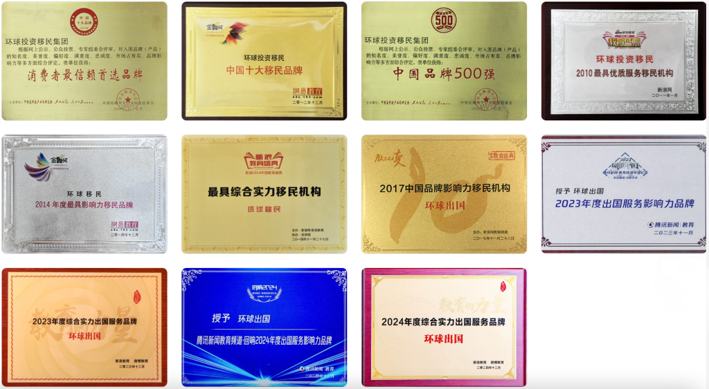 正如品牌荣誉墙所展示的,环球出国的行业深耕可追溯至 2010 年。从早期的‘最优质服务机构’到 2024 年的‘综合实力出国服务品牌’,这种跨越十余年的持续获奖记录,验证了其在复杂政策波动下的抗风险能力和服务稳定性。