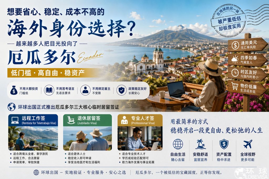 要么门槛高得离谱,普通家庭踮起脚尖也够不着;要么政策说变就变;要么生活成本高得让人肉疼;要么为了跟海外业务对接,天天过着昼夜颠倒的日子。环球出国这几年在全球各国里反复对比、实地试验,最终把这个在地球的另一端,被低估、却实用的选择,完整带到申请者面前。它把「低门槛、高自由、稳资产」几个字,真正砸进了现实。它就是厄瓜多尔——全球少数同时拥有太平洋海岸、安第斯山脉、亚马逊雨林和加拉帕戈斯群岛四大自然风貌的国家。不用大额投资,不用苦考语言,不用绑定本地雇主。通用美元、四季如春、时区友好、物价低廉。这个国家正悄没声息地成为跨境从业者、数字游民、退休养老人群的新宠。这一次,环球出国正式推出厄瓜多尔三大核心临时居留签证:远程工作签、退休居留签、专业人才签。用简单的方式,帮申请人稳稳开启一段更自由、更松弛的人生。