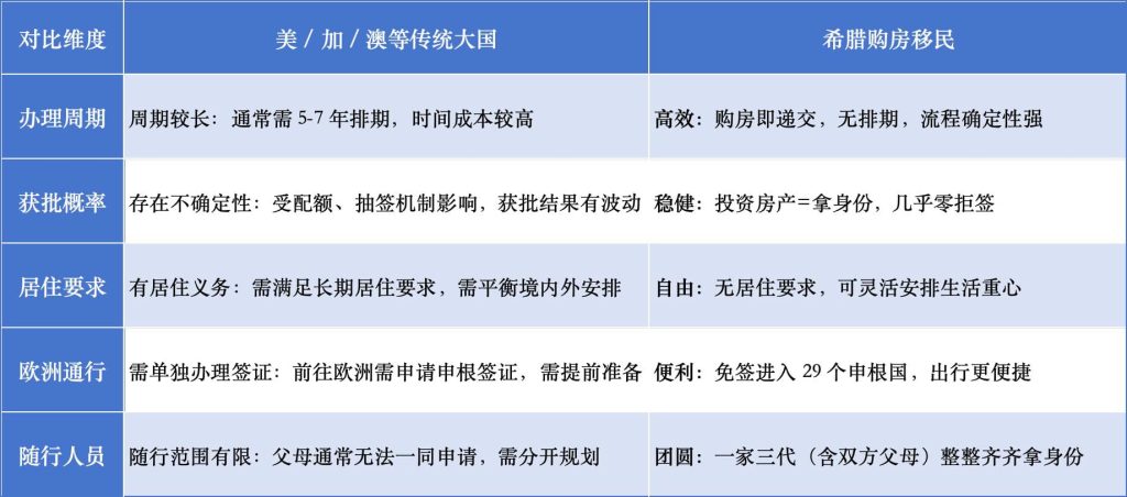 在环球,很多客户已经在办甚至已经拿到美国、加拿大、澳洲的身份,却依然愿意再办一个希腊。我们做了一个直观的对比,您一看便知: