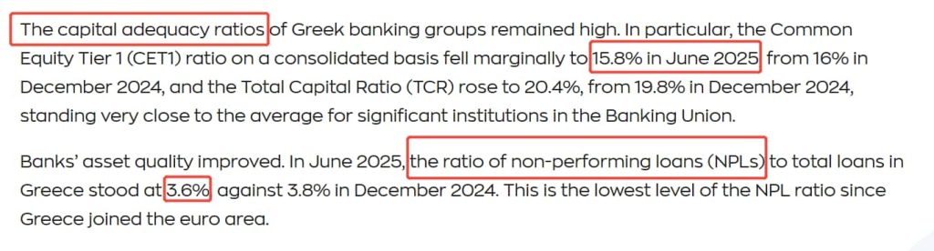 即将结束的2025年,希腊银行业向全球投资市场交出了一份超预期的答卷:银行业不良贷款(NPL)率从危机时期的35%跌至3.6%(截至2025年6月);而衡量银行抗风险能力的核心一级资本充足率达15.8%,远超欧盟要求的4.5%。