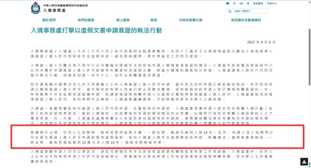 c. 刑事指控与监禁风险:根据香港《入境条例》,提供虚假陈述或文件属刑事犯罪,一经定罪,至高罚款15万港元及入狱14年。您的“案底”将会跟随您一生。