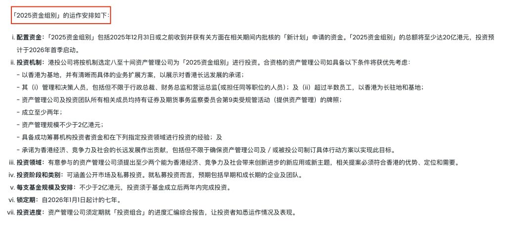 根据港投公司公布,2025资金组别截至2025年底规模至少达30亿港元,资金将平均分配予上述10家资产管理公司。投资机制延续了严格的遴选标准,包括: