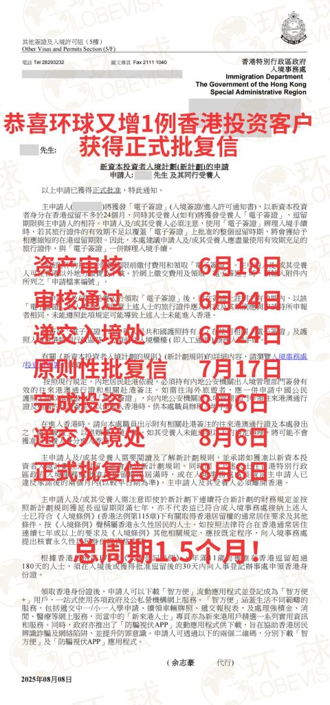 4、周期快资料简单:因为香港投资入境计划不要求客户提交个人背景和公司运营以及个人收入税单的资料,只要简单的个人文件就可以申请,获得原则性批复后就投资,投资完成了就可以入港办理身份证。环球近期递交和获批的案例,更快的客户案例从递交申请到获得正式批复就只要1个半月,慢的也就7.5个月,平均是3-4个月就拿到正式批复。远远比筛选制度的计划拿到身份要快速!