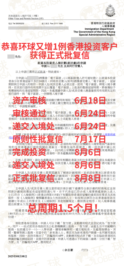 自 2024 年 3 月 1 日开放申请以来,环球出国已协助超千组申请人递交至投资推广署,积累了丰富的行业实操经验。其中,已有约 80% 的申请人获发正式批复及香港身份证。