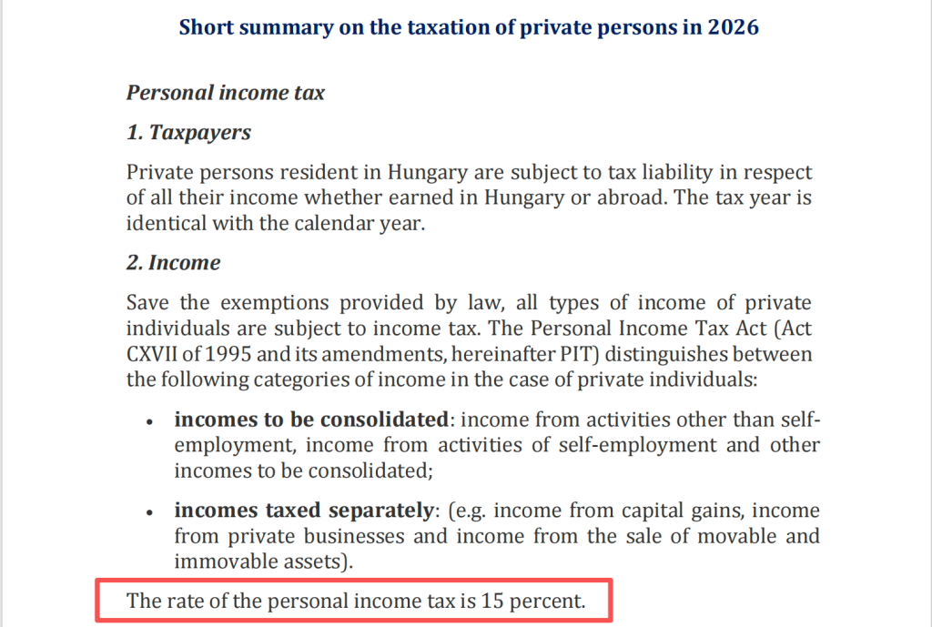 单一税率的逻辑红利: 对于高收入群体而言,复杂的“阶梯税制”不仅意味着更高的财务成本,更带来了较高的算力负担。然而,根据匈牙利国家税务和海关管理局(NAV)的 2026 年准则,匈牙利坚定执行 15% 的单一税率(Flat Tax)。