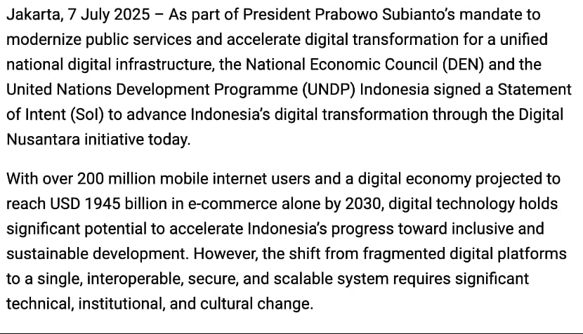 All Indonesia的实现并非制度的孤立,而是基于更大的国家数字战略框架。 2025年7月,国家经济委员会 (DEN) 和联合国开发计划署 (UNDP) 印尼办事处签署了一份意向声明 (SoI),旨在通过“Digital Nusantara initiative”全速推进印尼的数字化转型。