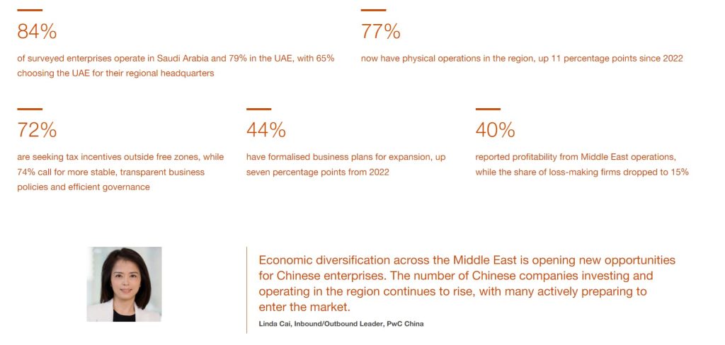 中沙两国在“跨境合作”框架下的合作日益紧密,为中国企业创造了优越的投资环境。普华永道(PwC)报告显示,超过60%的受访企业对其在沙特的收益表现表示满意,这一数据充分证明了沙特市场的盈利潜力。同时,40%的企业已在当地实现盈利,亏损企业比例降至15%,反映出沙特市场的成熟度正在快速提升。