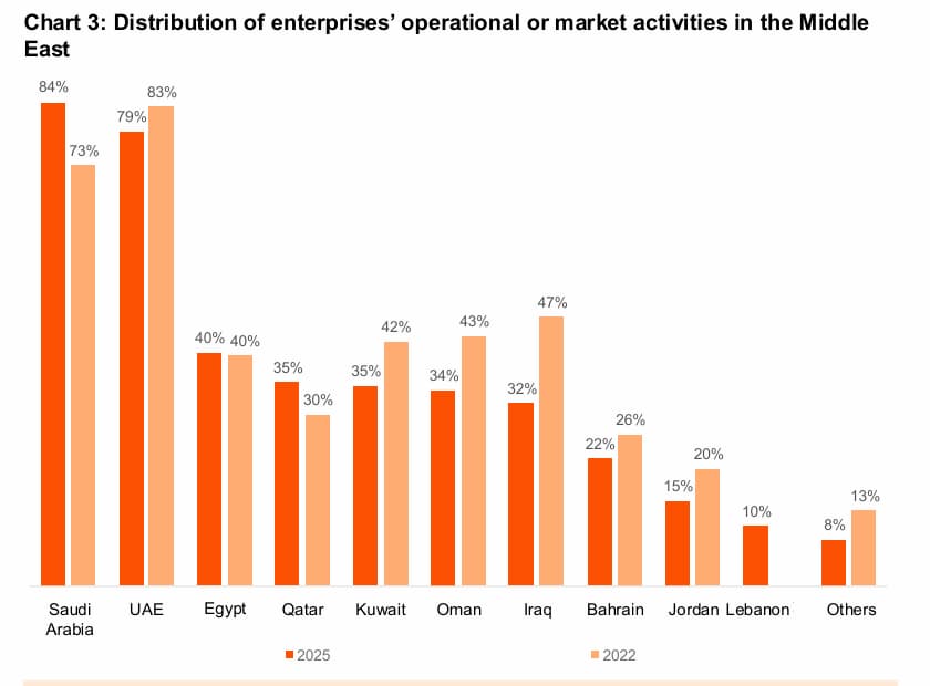 该报告进一步指出,中国企业在中东的发展模式正经历根本性转变:77%的企业已从设立代表处升级为建立全面运营的本地实体。这一转变直接反映在业绩上:40%的企业报告其在中东业务已实现盈利,而亏损企业的比例已降至15%。这些数据共同印证,中东市场,特别是沙特,已从过去的“可选题”转变为中国企业全球化布局中至关重要的“战略枢纽”。
