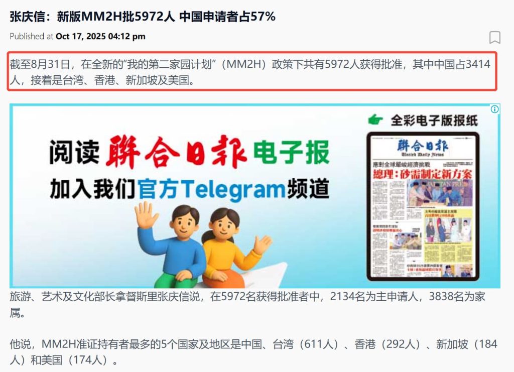 近日,马来西亚官方公布了“第二家园计划(MM2H)”新的获批数据:自去年下半年新政开放以来,共有5,972名申请人成功获批。在这份官方数据中,一个细节值得深思中—超过57%的获批者,来自中国大陆,达3,414人,稳居首位。
