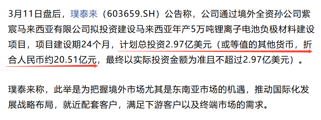 3月11日,出海领域迎来标志性动态:中国锂电负极材料领先企业璞泰来(603659.SH)发布公告,拟通过境外全资孙公司在马来西亚投资建设年产 5 万吨锂离子电池负极材料生产基地。
