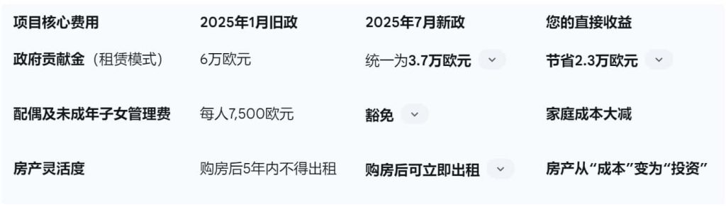 在旧政下,如果选择租房模式,主申请人需要支付高达€5.8万欧元的政府捐款。但新政一出,租赁和购买模式的捐款部统一为€3.7万欧元 。这一下子就为你省下了€2.1万欧元,约合人民币16万元 !这可不是小数目,是实实在在的红利。