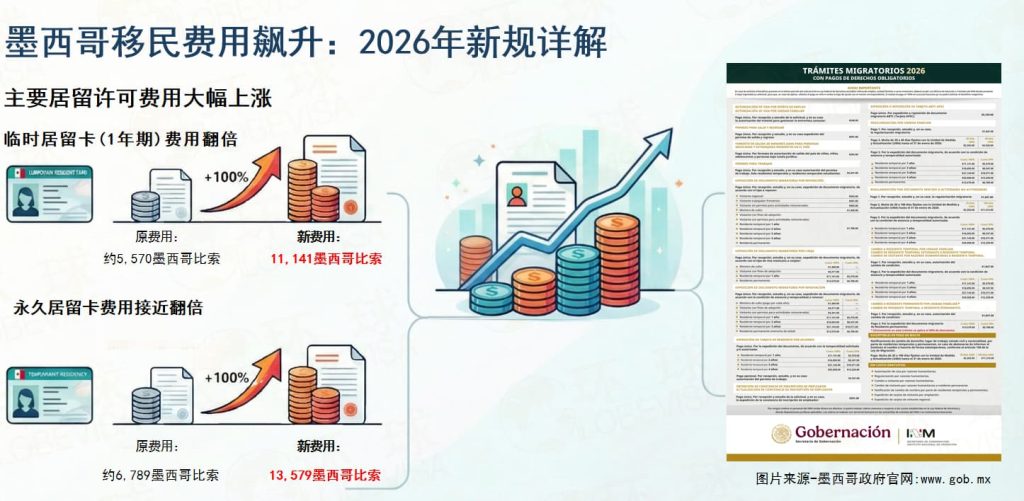 2026年1月,受墨西哥地缘经济地位提升及全球申请量持续攀升的影响,墨西哥移民局(INM)生效的一纸公告,在全球身份配置市场引发剧烈震荡。为平衡供需关系并重新评估行政成本,墨西哥政府通过《联邦权利法》修正案,正式实施了罕见的激进调价:从核心的临时居留到永久居留,多项制卡规费涨幅均超过100%。这一举措不仅是单纯的财政费率更新,更标志着在北美地缘经济变局下,墨西哥政府正通过大幅提高准入门槛,对其国家身份的“入场券”价值进行强势重估。点击下方“阅读原文”,免费让环球的专业团队为您定制墨西哥移民方案!