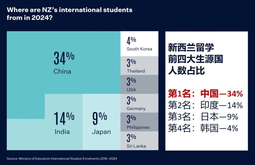 官方数据显示,2024年国际学生入学总人数相较2023年增长21%。而中国是首大生源国,占新西兰留学生总人数的34%,成为战略重点——2024年近万名中国本科生占国际本科新生半壁江山,硕士生数量更达12年峰值,其“优质生源”标签获得官方背书。