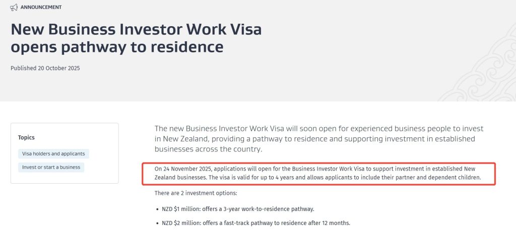 2025年10月20日,新西兰移民局官网正式发布Business Investor Work Visa(商业投资工作签证)细节,该工签将于11月24日正式开放申请,为全球高净值商业人士打开一条“真金白银换身份”的绿色通道。