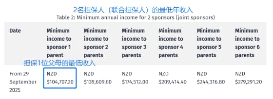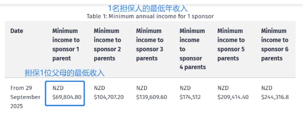 子女担保:担保一位父母时,担保人(新西兰公民 / 居民)年收入需达到新西兰中位数工资(约 6.98 万纽币/年),担保父母人数增加则对应收入标准相应上调;