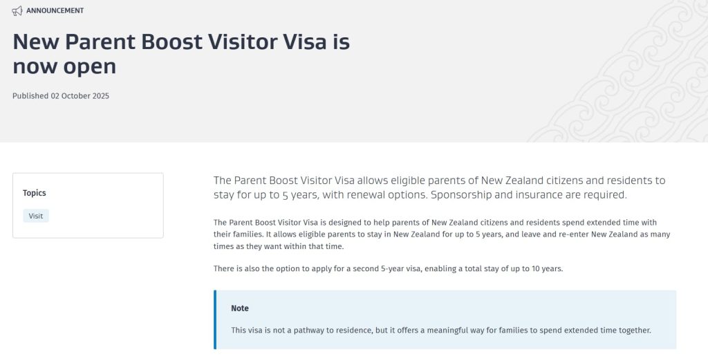 为响应移民群体的长期团聚诉求,新西兰政府在家庭移民政策上再次迈出重要一步:于 2025 年 9 月 29 日正式推出了父母超级签证(Parent Boost Visitor Visa)。这项政策的落地,精准填补了传统探亲签(短期停留)与团聚移民(配额紧张、周期漫长)之间的巨大需求空白,为新西兰公民和永久居民的父母开辟了一条长期、稳定、灵活的探亲通道。