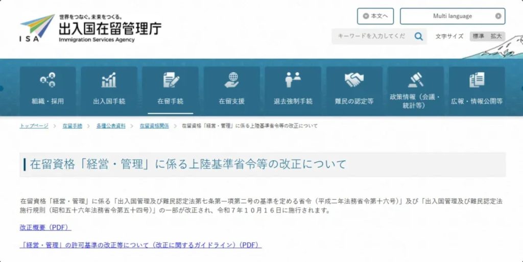 日本出入国在留管理厅(ISA)于10月10日正式公示,对「经营・管理」及相关在留资格的上岸标准进行了重大修改,新政于10月16日正式生效,几乎零缓冲期。根据新政,注册资本由500万日元提升至3000万日元,新增雇佣特定身份员工、日语能力及管理经验/学历等要求,商业计划书需经中小企业诊断士确认。新政大幅提高申请门槛,意味着未来申请经营管理签证及永居的难度显著增加。
