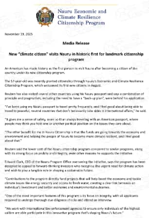 2025 年11月,据瑙鲁官方披露,首个美国籍瑙鲁公民身份获批者不仅亲赴瑙鲁,更公开分享持瑙鲁护照的旅行体验,称其已凭该护照前往全球多个国家。作为中立国家,瑙鲁推出的经济与气候韧性公民身份计划,以相对低成本、与严谨合规背调、资金透明流向气候建设而著称。瑙鲁护照=高性价比+高合规,快至3-5个月拿护照,全程0登陆0居住0录指纹,抢占红利期!