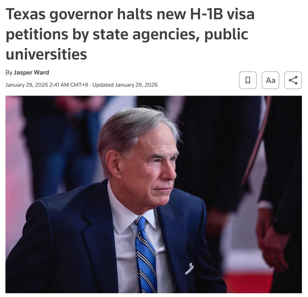 图片来源:https://www.reuters.com/legal/government/texas-governor-halts-new-h-1b-visa-petitions-by-state-agencies-public-2026-01-27/
