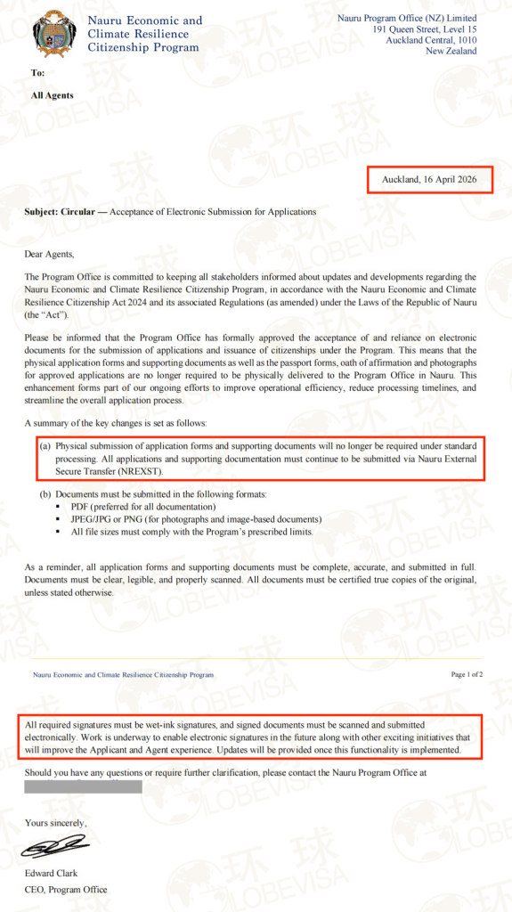 瑙鲁经济与气候韧性公民计划办公室于 4 月 16 日发布通知:即日起,所有申请材料(包括申请表、支持文件、护照表格、宣誓书及照片)均无需再邮寄至瑙鲁本土,全程采用电子提交。目前申请仍需提供手写签名扫描件,电子签名功能正在开发中,上线后将第一时间同步。此次升级将显著提升审批效率、缩短整体周期,为申请人提供更便捷的服务体验。