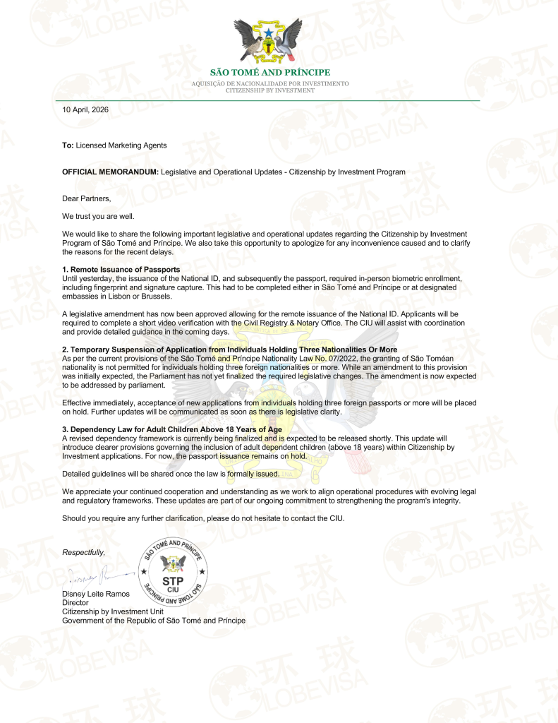 圣多美和普林西比投资入籍局(CIU)于2026年4月10日发布通知 ,宣布通过立法修正案实现了国民身份证的远程视频核实签发 ,同时依据现行国籍法暂停接收持有三本或以上外国护照人士的新申请 ,并明确18岁以上成年子女的附属申请规则正在修订中。