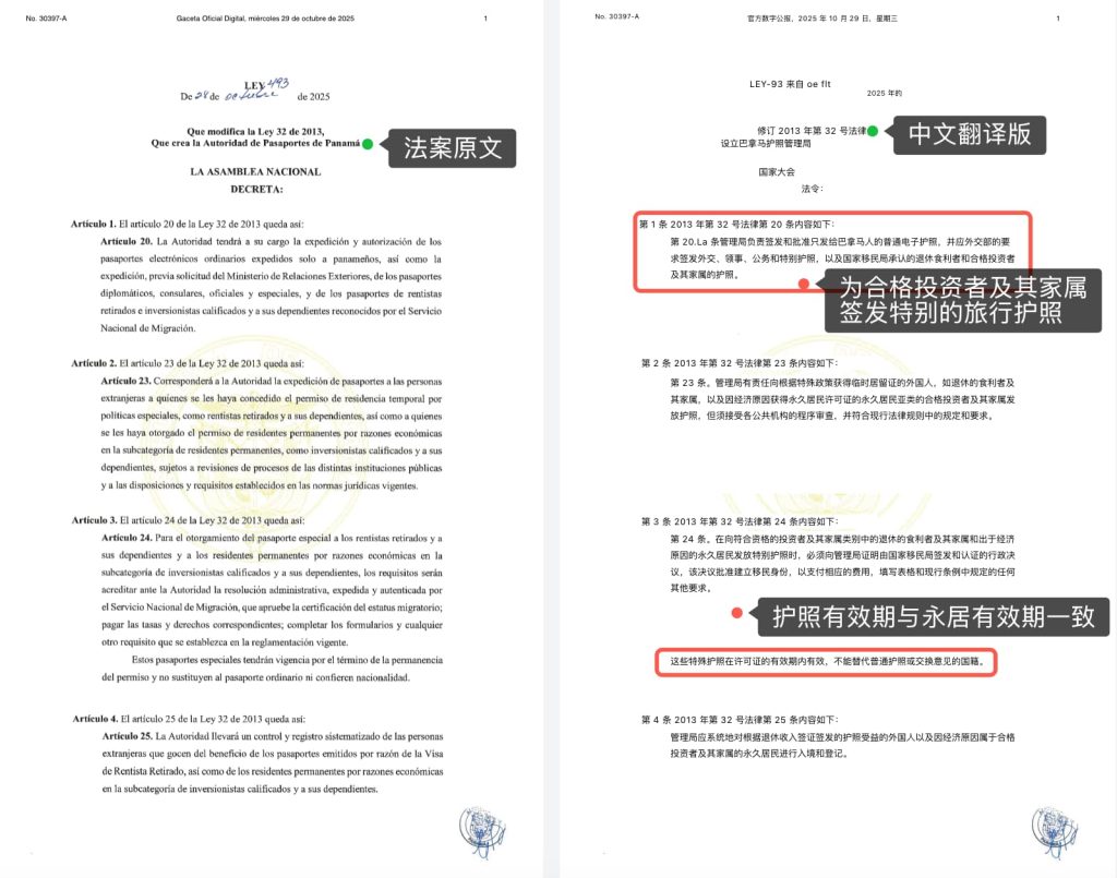 新颁布的《2025年第493号法律》明确将“合格投资者”身份(即巴拿马投资移民投资人)纳入了护照管理局的签发范围。