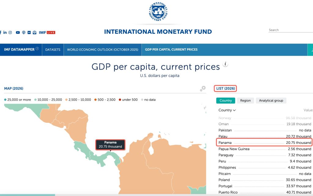 根据国际货币基金组织(IMF)2026 年的预测,巴拿马人均 GDP 已达20,750 美元,不仅远超秘鲁、巴拉圭等周边国家,更跻身全球中高收入经济体行列。
