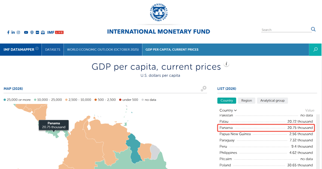 • 人均 GDP 表现卓越: 根据国际货币基金组织(IMF)2026 年的最新预测,巴拿马人均 GDP 已达 20,750 美元。这一数据显著高于秘鲁、巴拉圭等周边国家,进一步确立了其全球中高收入经济体的地位(数据来源:IMF 2026 World Economic Outlook)。