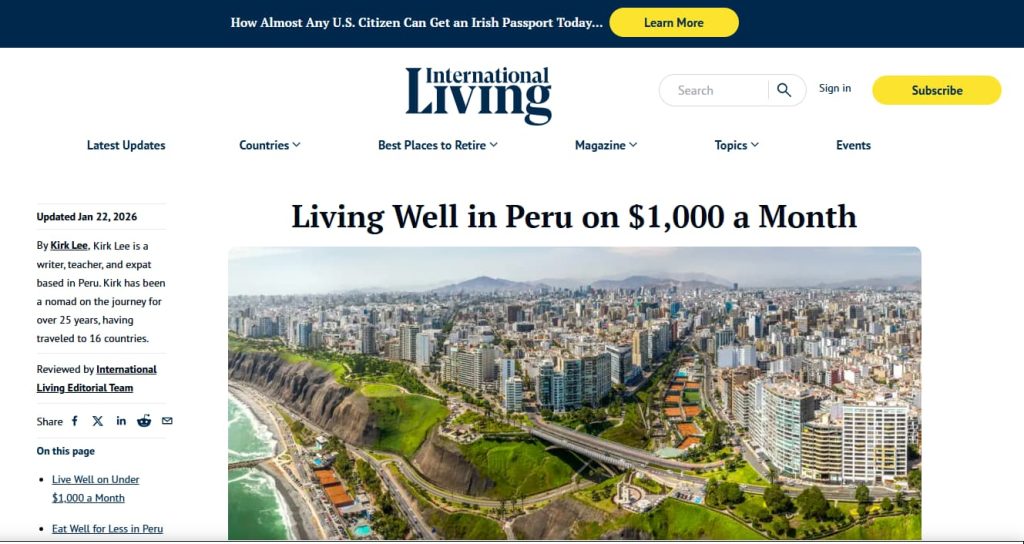 双重权威背书!International Living 2026报告:秘鲁低成本退休天堂持续上榜,阿雷基帕expat社区快速增长