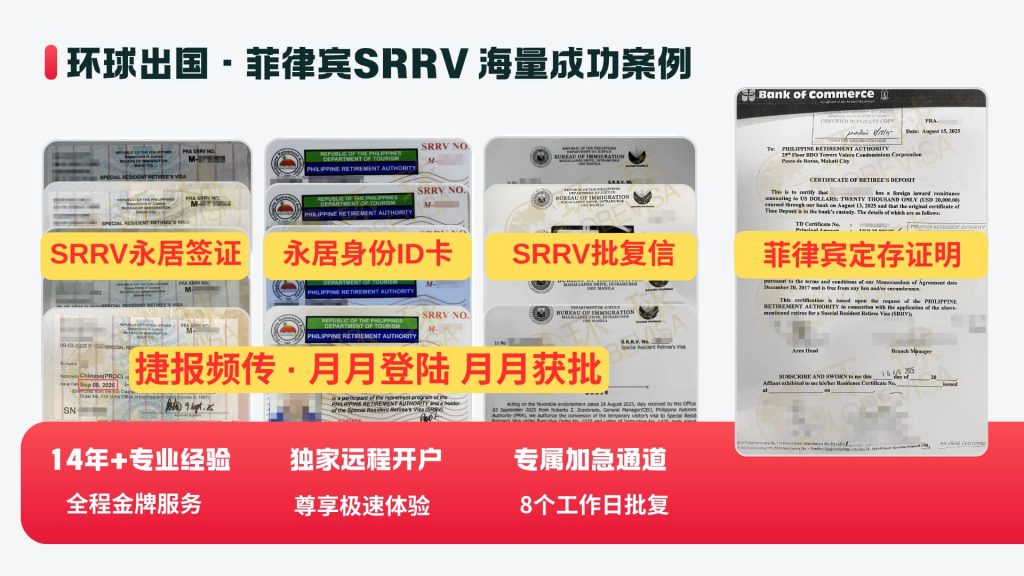 环球出国自2011年起专业办理菲律宾SRRV项目,迄今已协助上千组家庭成功获得永居身份。我们提供两项核心服务:远程开户支持,协助客户快速开立个人银行账户,流程便捷;尊享加急通道,SRRV审批8个工作日内完成,大幅缩短等待时间,助力快速拿永居。服务全程覆盖,为您提供从申请到安家的专业支持。