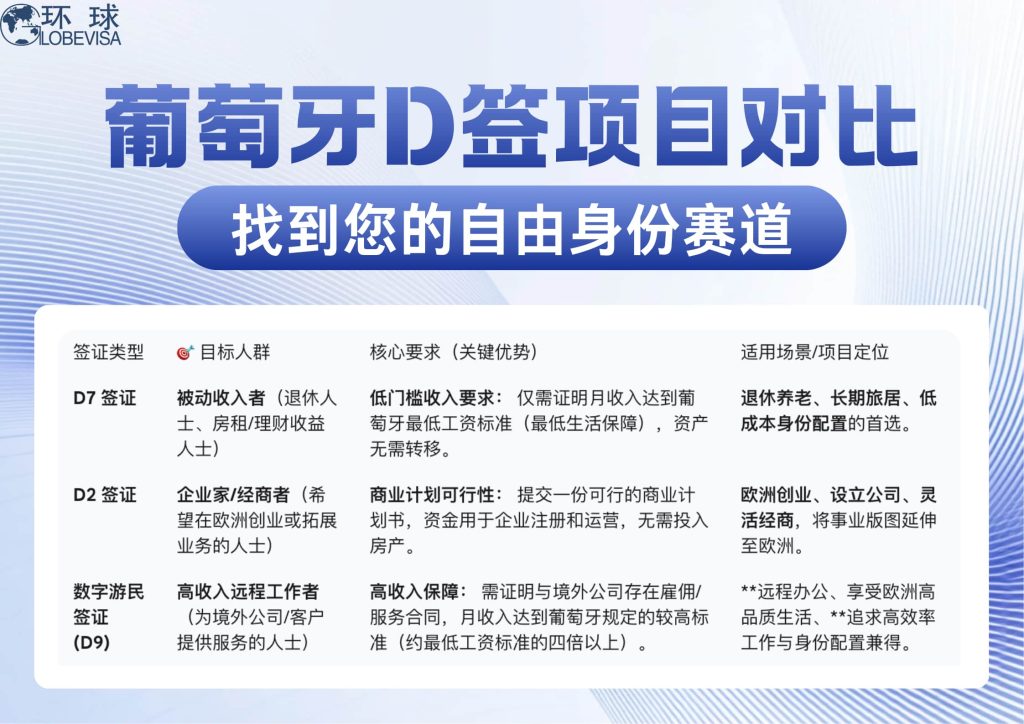 环球出国为您隆重推荐——葡萄牙 D 类长期居留签证(D2、D7、D9)。它不仅是零投资的身份起点,更是葡萄牙政府官方授权您的自由身份许可证。许多人误以为欧洲长期居留身份只有投资移民才能工作。在葡萄牙,答案是响亮的“不”! D 类长居直接赋予您在当地自由工作、经商、创业的权利,让您的身份价值得到真正的释放。