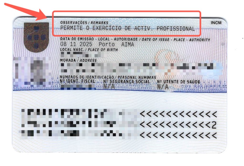 如何证明这不是空口承诺?答案就印在您拿到的居留卡背面!通过D2、D7、D9类签证获得的居留卡背面,都明确印有葡萄牙语的 “OBSERVAÇÕES / REMARKS”,其中清晰标注:“PERMITE O EXERCÍCIO DE ACTIV. PROFISSIONAL” (允许从事职业活动)