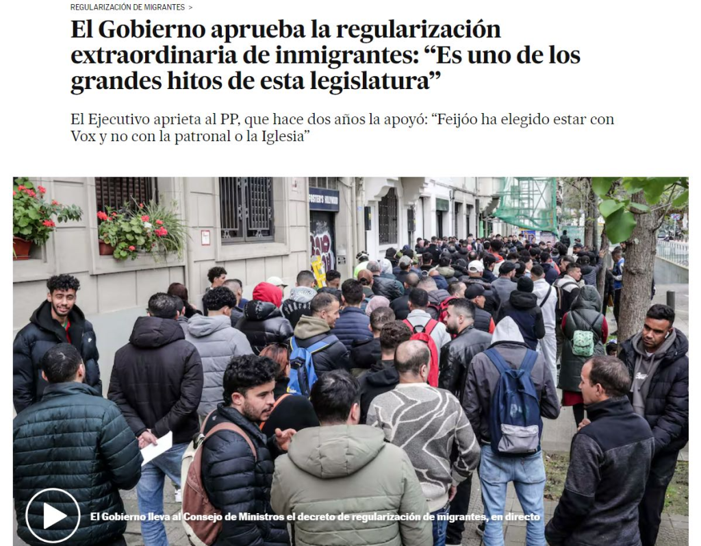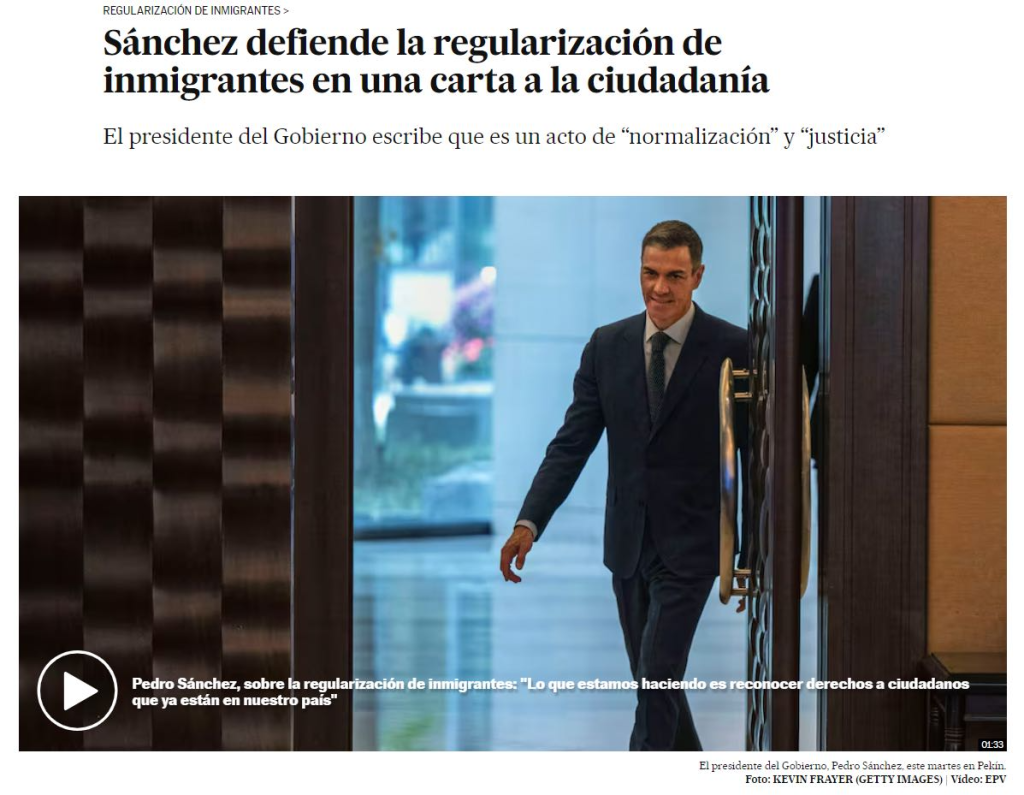 来源:El Pais|Sánchez defiende la regularización de inmigrantes en una carta a la ciudadanía,2026/04/14