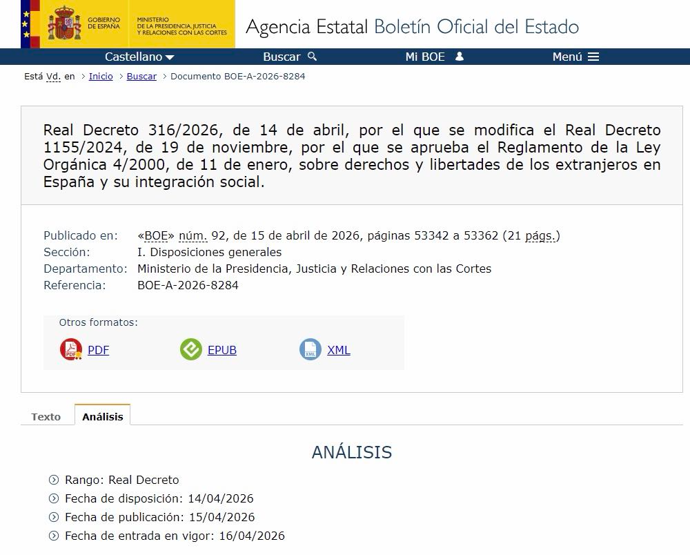 来源:Agencia Estatal Boletín Oficial del Estado|Real Decreto 316/2026, de 14 de abril, por el que se modifica el Real Decreto 1155/2024, de 19 de noviembre, por el que se aprueba el Reglamento de la Ley Orgánica 4/2000, de 11 de enero, sobre derechos y libertades de los extranjeros en España y su integración social, 2026/04/15