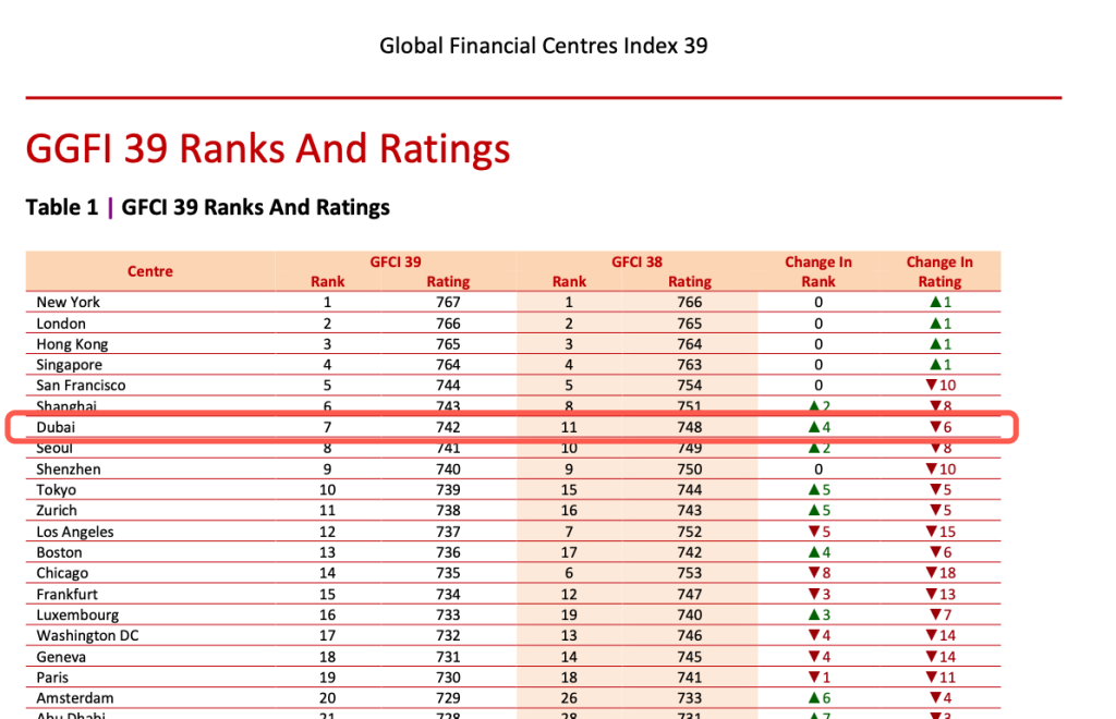 然而,市场的深度洞察往往在波动期更为凸显。在部分投资者选择观望时,专业资本正表现出更强韧的入场意愿。2026年3月26日,第39期全球金融中心指数(GFCI 39)正式发布,其结果为市场带来了重要参考:在复杂的国际环境下,迪拜的金融地位依然稳健,其排名超越了洛杉矶和芝加哥,从全球第11位跃升至全球第7位,正式跻身全球金融中心的第一梯队!